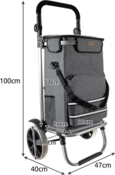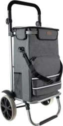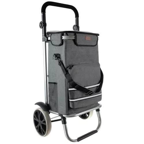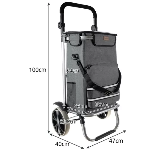 La bolsa está fabricada con material resistente e impermeable, con película térmica de aluminio para prolongar la frescura de los alimentos. Gracias a la correa de hombro desmontable, puede transportarse fuera del bastidor del carrito; el práctico bolsillo frontal permite un acceso rápido a pequeños objetos. Todo el carrito se pliega a un tamaño compacto para guardarlo fácilmente en casa o en el maletero del coche.