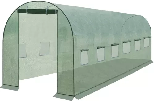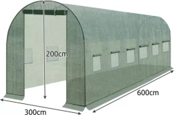 Resistente lona de repuesto verde para túnel de jardín de 6 × 3 × 2 m (18 m²) de la marca GARDLOV. Material PE 140 g/m² con rejilla de refuerzo integrada, resistente a los rayos UV, impermeable y poco susceptible a la deformación. Dos secciones de entrada con cremallera y ventanas laterales con mosquitera que garantizan ventilación, regulación de la humedad y un microclima estable para un crecimiento más rápido de las plantas. Solo la lona: sin estructura.