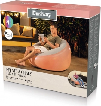 El sillón inflable BESTWAY de 102 × 97 × 71 cm es una solución práctica para el hogar, dormitorio universitario o terraza. Gracias a la iluminación LED integrada (7 colores), crea un ambiente agradable para ver películas, una noche de juegos o descansar tras el trabajo. Al desinflarlo ocupa muy poco espacio y se transporta con facilidad.