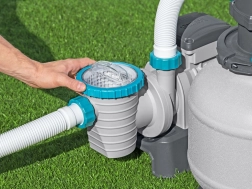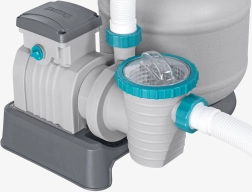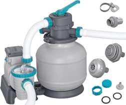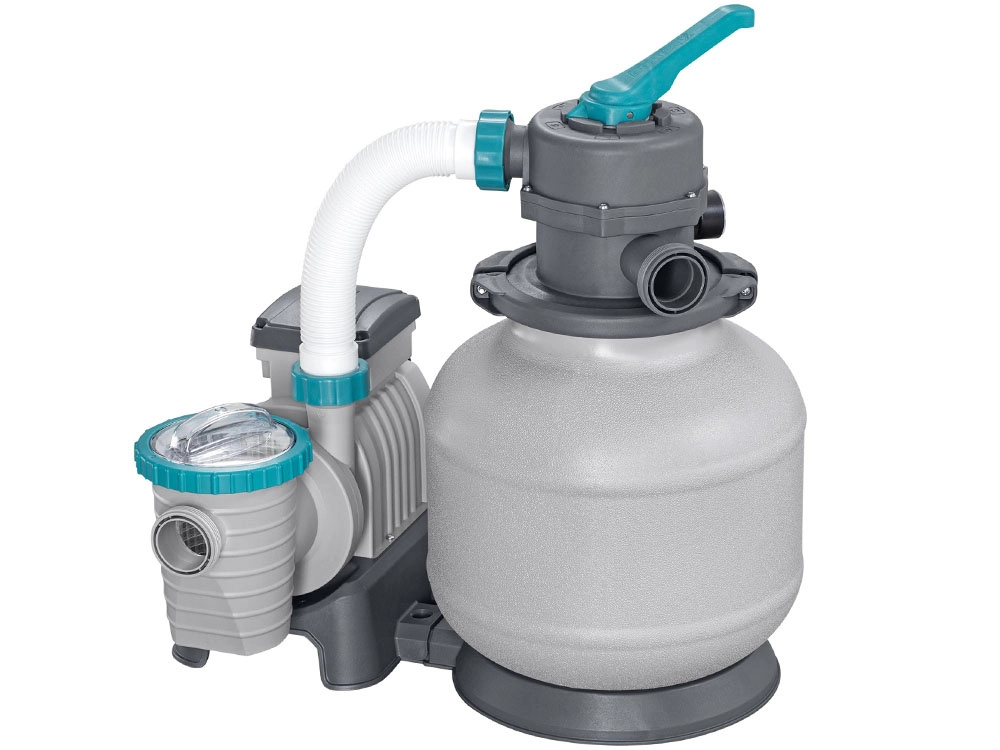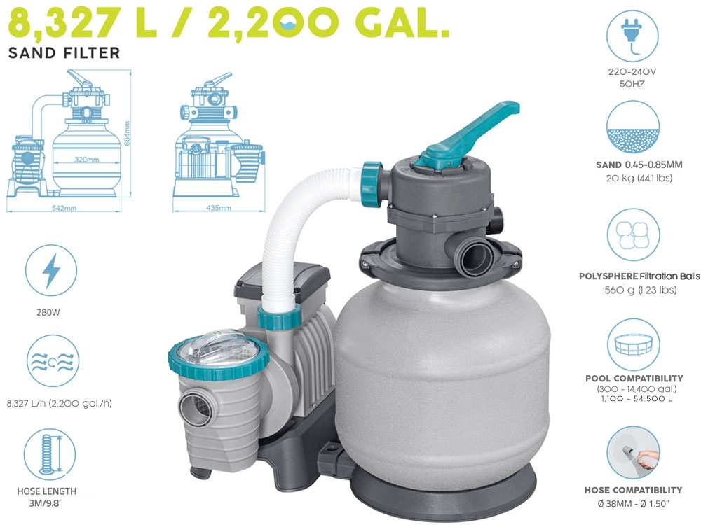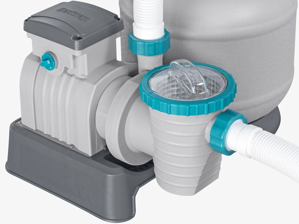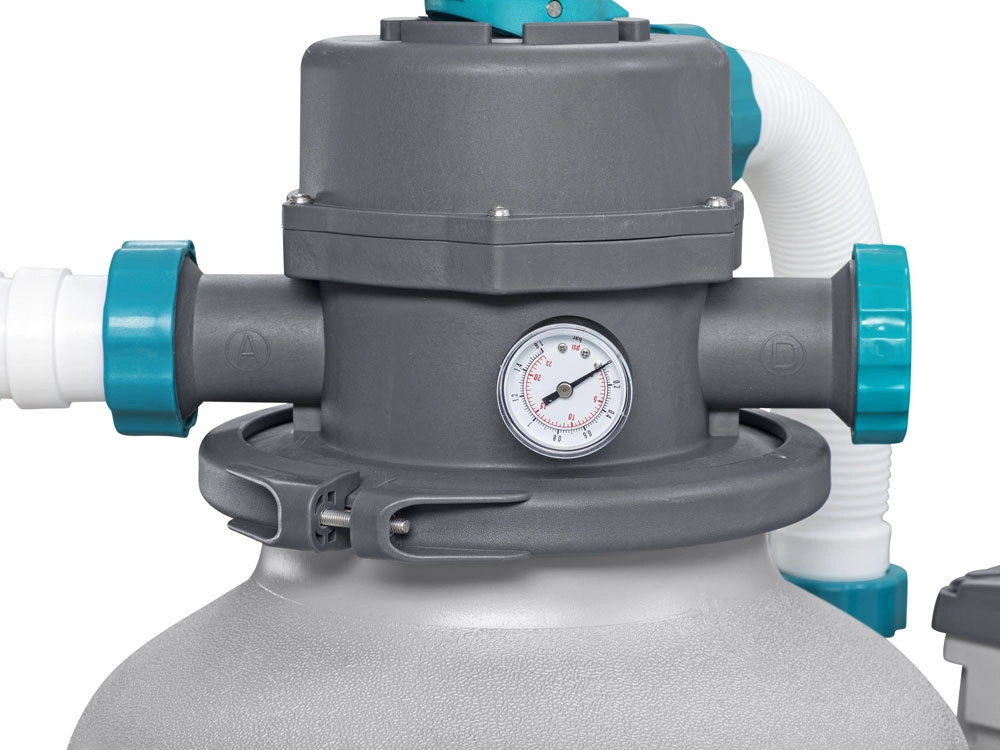 El potente filtro de arena BESTWAY con caudal de 8327 l/h mantiene el agua de la piscina cristalina. Ofrece válvula multifunción de 6 posiciones, manómetro para un control sencillo de la presión y temporizador automático. Compatible con arena de sílice de 0,45–0,85 mm y bolas filtrantes, ideal para piscinas con un volumen de 1 100–54 500 l.