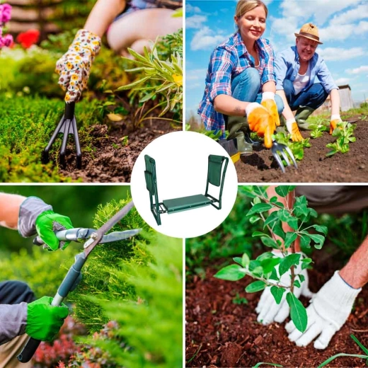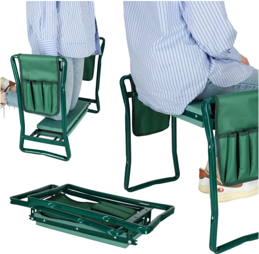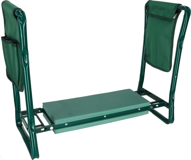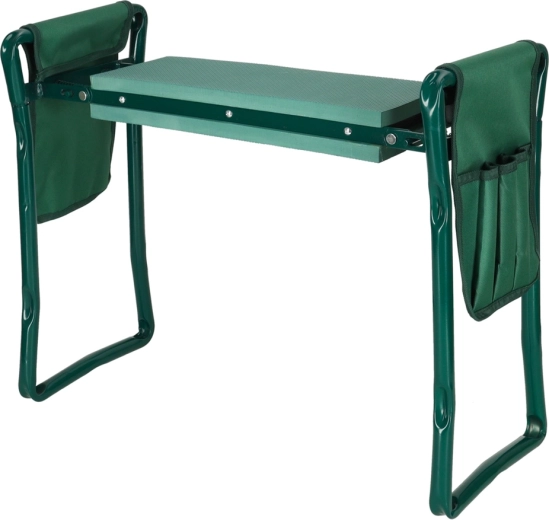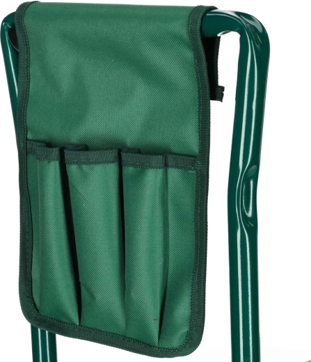 Las prácticas bolsas dobles colgantes con bolsillos mantienen tijeras, palita o guantes a mano. La estructura plegable permite un plegado rápido y un transporte y almacenamiento sencillos. Los materiales resistentes —metal, espuma y poliéster— garantizan una larga vida útil y fiabilidad en el uso diario.