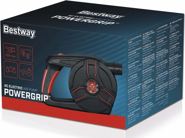 Esta bomba eléctrica de la marca Bestway combina gran potencia con amplia compatibilidad. Está equipada con tres válvulas universales, lo que la hace ideal para diversos inflables, como colchones, juguetes de piscina y más. Con un caudal de aire de 1100 l/min, garantiza un inflado rápido y puede cambiarse fácilmente al modo de desinflado para un almacenamiento sencillo. La bomba se alimenta desde una toma doméstica de 220 V y alcanza una presión de 0,97 PSI, lo que la hace adecuada incluso para artículos más grandes que requieren alta presión.