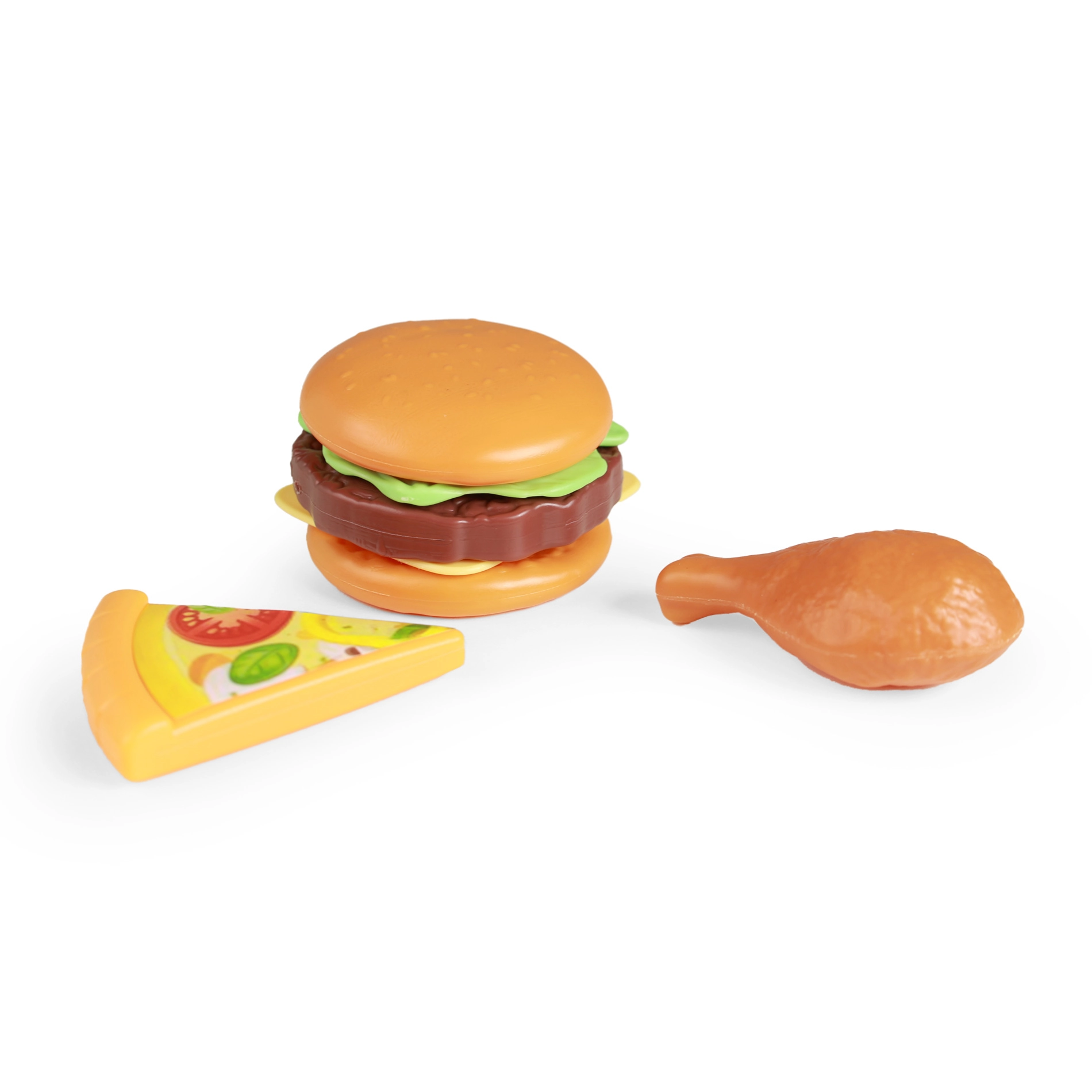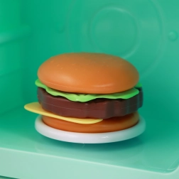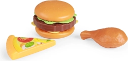 El paquete incluye una hamburguesa, un pollo y una pizza. Los accesorios amplían las posibilidades de juego, fomentan la imaginación y el juego de roles en la cocinita infantil.