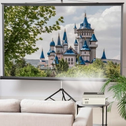 Crea un cine en casa con un proyector ligero y fácil de guardar que proyecta hasta 100" en relación 16:9. El enfoque manual y el trípode incluido ayudan a ajustar rápidamente el tamaño y ángulo ideales. Gracias al soporte de señal Full HD 1920 × 1080 px obtendrás una imagen limpia y llena de detalles.