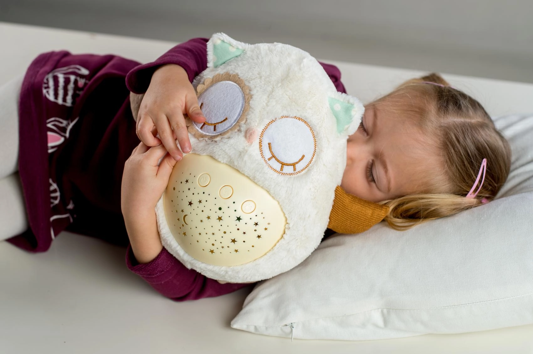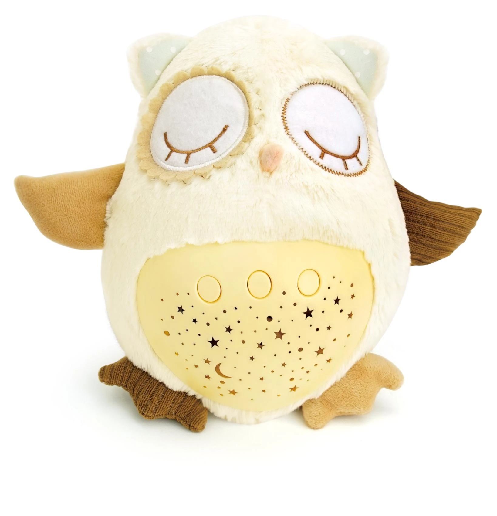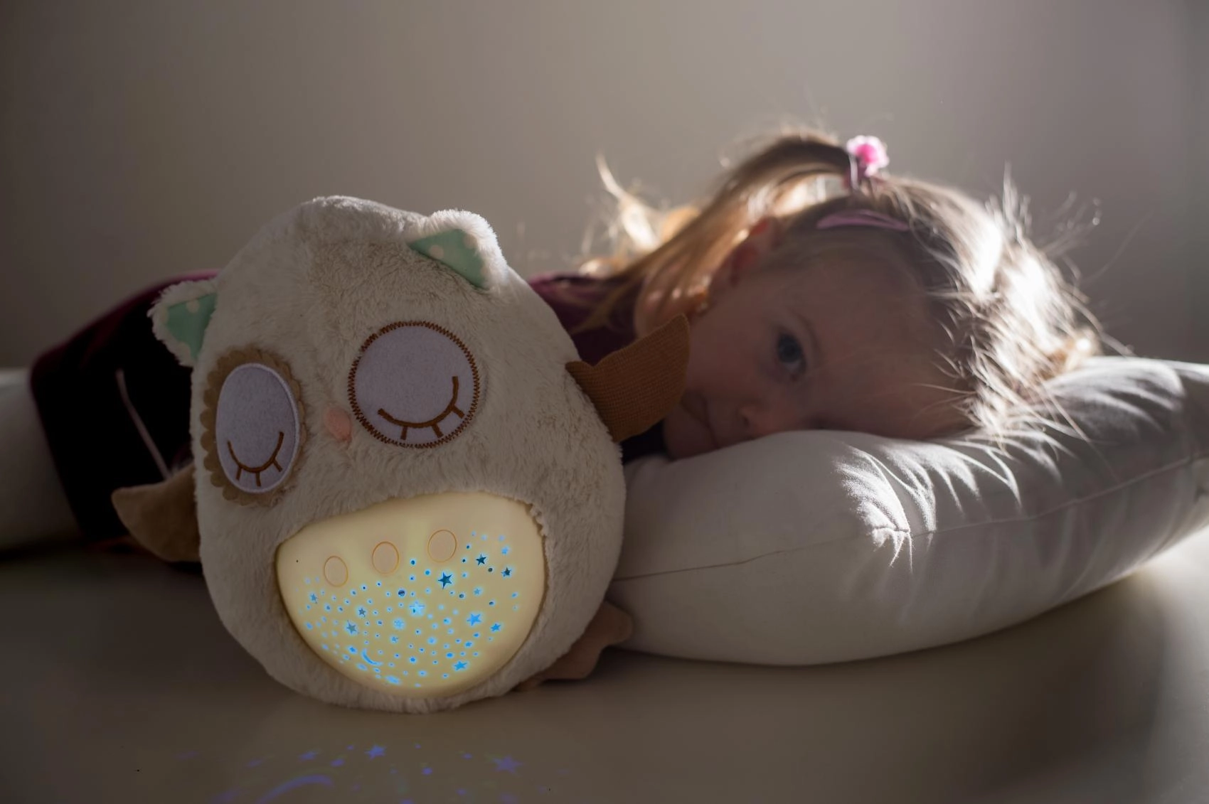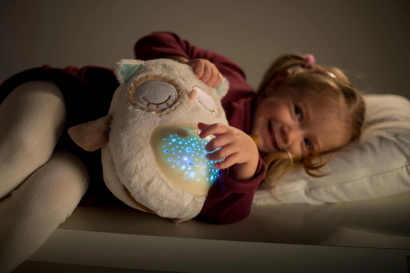 El manejo es sencillo gracias a los botones en la barriguita, por lo que puedes ajustarlo incluso a oscuras. Gracias a su tamaño compacto, el buhito es ideal para la cuna y para llevar de viaje. El material suave y agradable invita a los mimos y ayuda a crear un tranquilo ritual nocturno.
