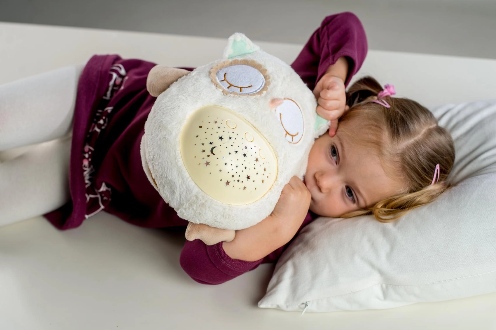 Este suave doudou de peluche combina un abrazo cálido con funciones inteligentes para dormir. El buhito proyecta un cielo estrellado en 8 colores, reproduce 8 nanas y sonidos prenatales relajantes a los que los más pequeños están acostumbrados desde el vientre de mamá. Tras terminar la melodía, la luz permanece suave durante aprox. un minuto y luego se apaga automáticamente.