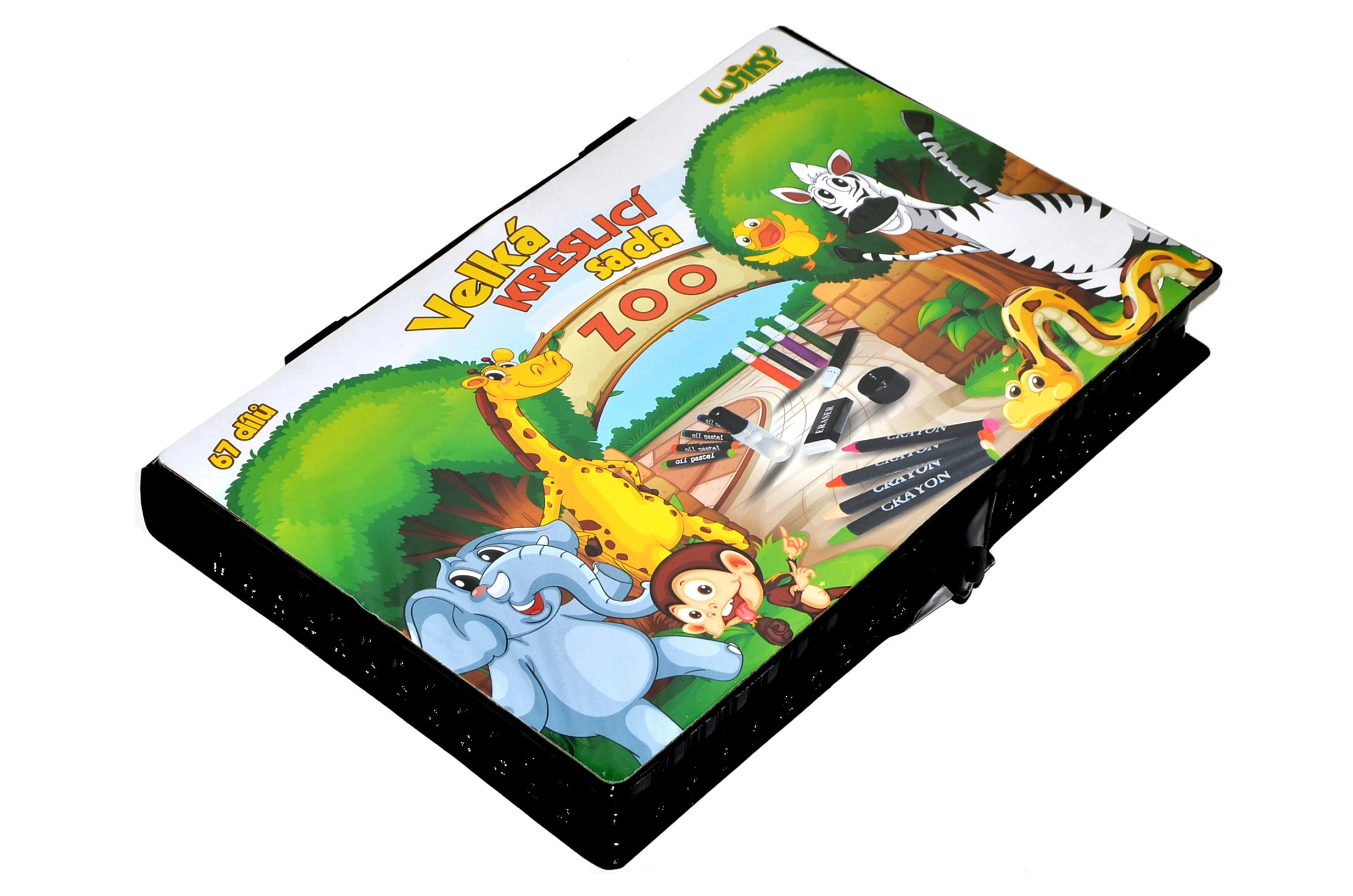 Práctico maletín de arte con motivo de ZOO que ofrece 67 piezas para pequeños y más grandes artistas. En su interior encontrarás 12 rotuladores, 12 lápices de colores, 12 ceras y 12 pasteles al óleo, además de acuarelas (12 tonos), lápiz, paleta, pincel, goma, sacapuntas, regla y pegamento para papel. Todo organizado en un maletín resistente: ideal para casa, la escuela y los viajes.