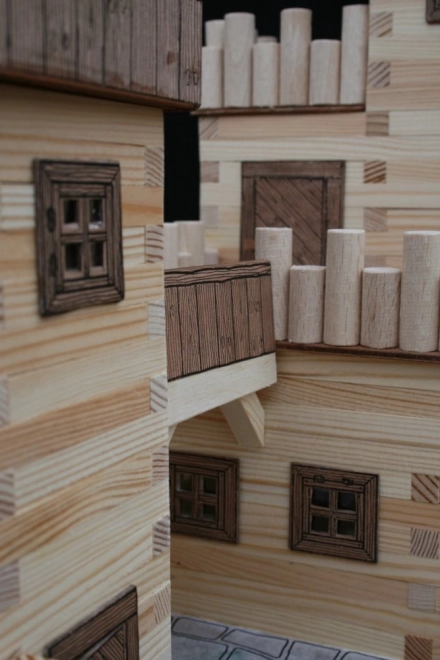 Listones de madera de 9×9 mm y complementos de papel (ventanas, puertas, techos) garantizan una apariencia fiel a la arquitectura medieval.