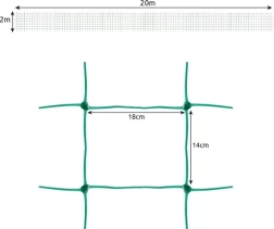 Montaje fácil y uso universal. La red puede instalarse en horizontal o vertical sobre estacas, marcos, postes o pérgolas. Las grandes mallas de 14 × 18 cm permiten regar, atar y podar cómodamente. El material PP con nudos reforzados garantiza estabilidad y resistencia al estiramiento y a los daños mecánicos.