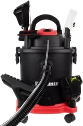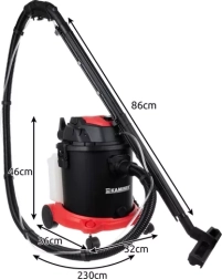 Potente aspiradora 3 en 1 KAMINER que combina limpieza en húmedo, aspirado en seco y función de soplado. Gracias a la doble filtración HEPA + filtro de espuma captura hasta el 99 % del polvo y alérgenos. El gran depósito de 20 l, el tanque para solución limpiadora de 3,5 l, el completo juego de boquillas y el funcionamiento silencioso de 58 dB(A) la convierten en una ayuda versátil para alfombras, tapicerías y suelos duros.