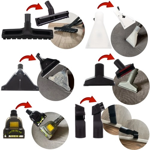 Manguera flexible, 2× tubo conector, filtro HEPA, filtro de espuma, bolsa textil 5,5 l, depósito para detergente 3,5 l, boquilla de extracción con pulverización de agua, punta pulverizadora, boquilla para asientos, boquilla cepillo para suelos, boquilla 2 en 1 para ranuras/polvo, turbo boquilla