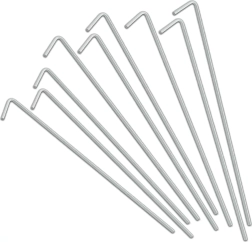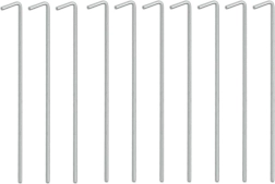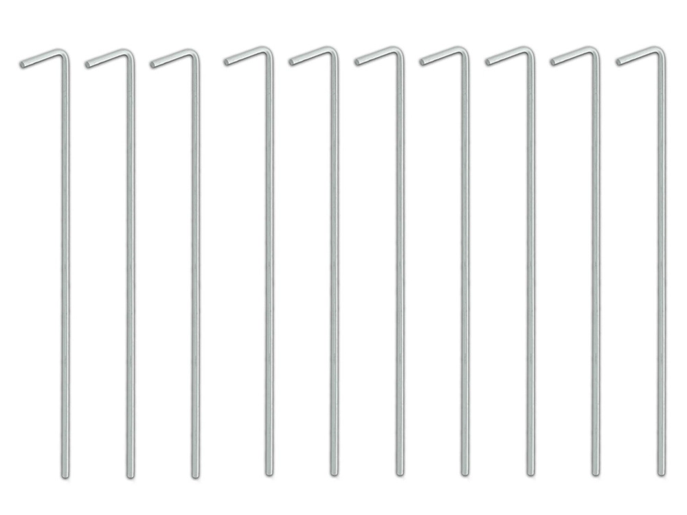 El práctico juego de 10 piquetas de acero con remate en L es ideal para acampada, jardín y senderismo. Gracias a su diámetro de 4 mm y longitud de 24 cm, las piquetas se mantienen firmes en hierba, tierra e incluso grava y evitan que se suelten cuerdas o cintas. Su forma sencilla permite clavar y extraer rápidamente.
