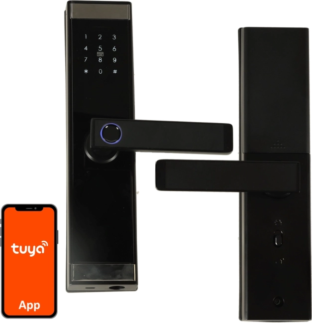 - Teclado táctil, lector de huellas, RFID, llave mecánica, app Tuya