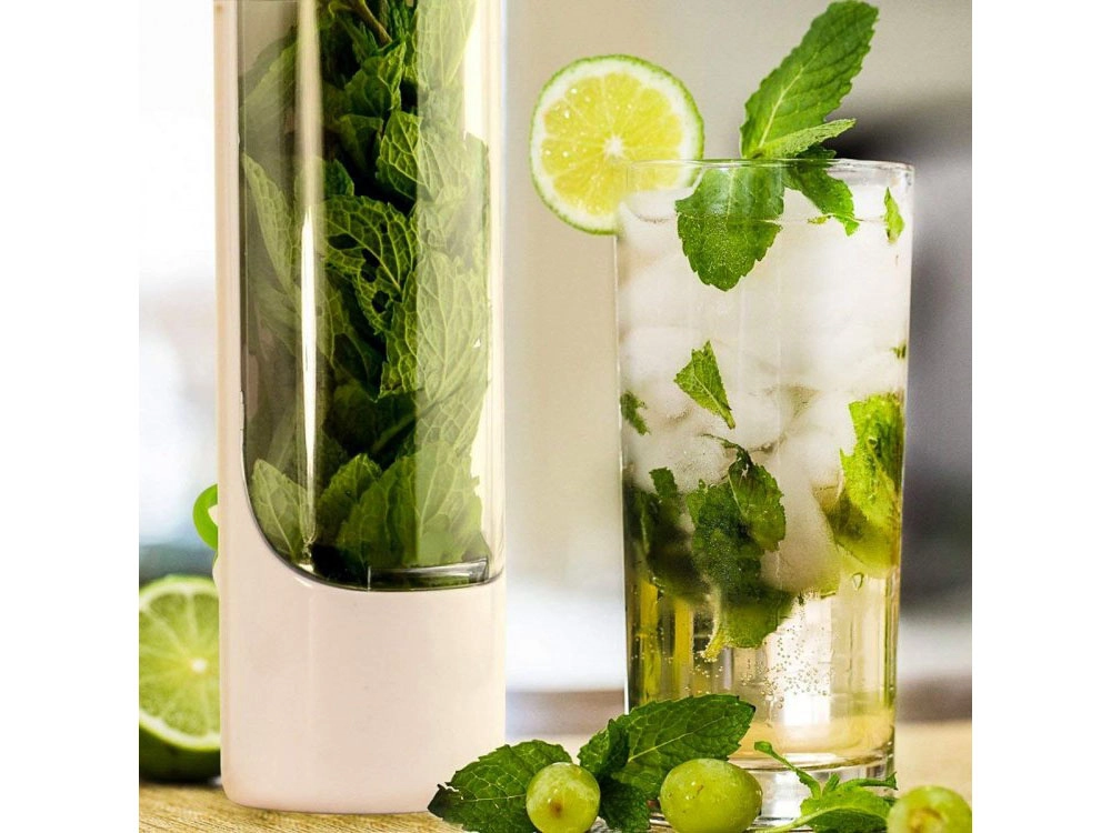 Las hierbas se mantienen de pie en agua y permanecen hidratadas, conservando por más tiempo su color, aroma y sabor. El cuerpo transparente y el tapón de silicona facilitan el control y el rellenado.