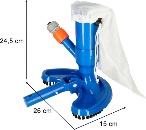 El montaje se hace en minutos: conecte el acoplador rápido a la manguera de jardín, inserte la aspiradora en una pértiga estándar de 30 mm y sumérjala en el agua. La suciedad capturada termina en la bolsa de malla, que tras la limpieza se vacía y se reutiliza. Ideal para piscinas, jacuzzis y estanques de jardín.