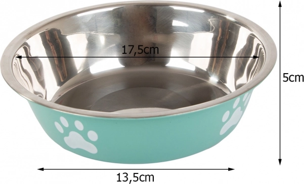 Elegante cuenco de acero inoxidable con capacidad de 400 ml, ideal para alimento y agua para perros y gatos. Gracias a la base de goma antideslizante se mantiene firme en su sitio, se limpia fácilmente y su construcción resistente con huellitas decorativas combina a la perfección con cualquier interior.