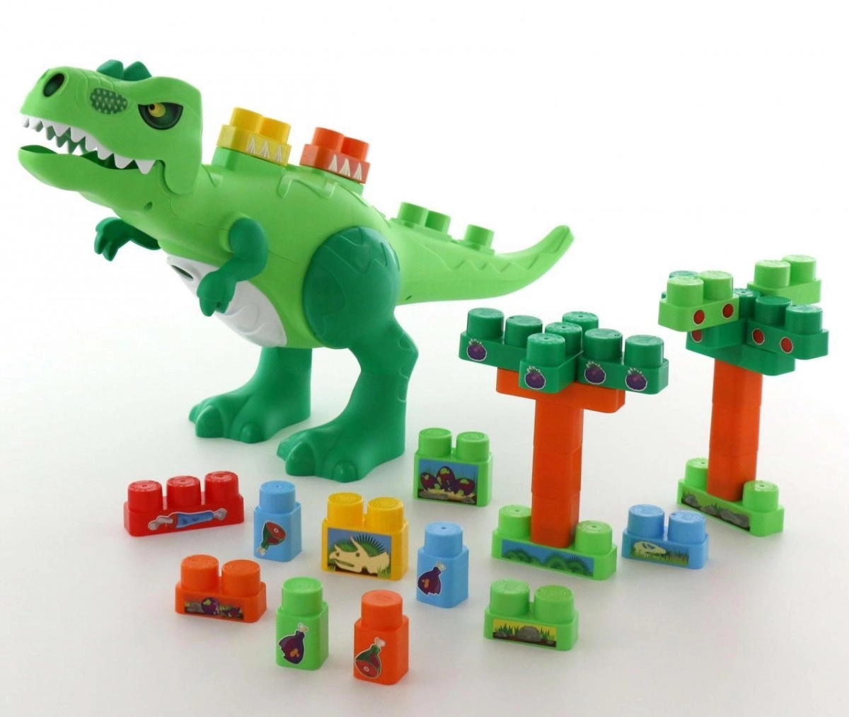 En el lomo y la cola del dinosaurio hay puntos para fijar las piezas, por lo que el niño puede diseñar por sí mismo cómo se ve el dinosaurio. La fácil extracción de las piezas desde la parte inferior permite crear un nuevo entorno para el dinosaurio.