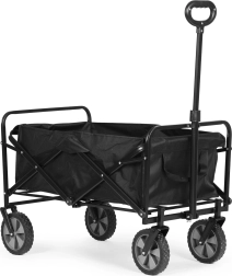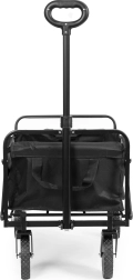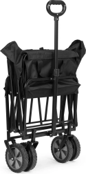 Las grandes ruedas con banda de rodadura de goma y el eje delantero giratorio garantizan una maniobrabilidad sencilla incluso a plena carga. El asa telescópica ancha ofrece un agarre seguro y cómodo. Tras su uso, el carrito se pliega en segundos hasta unas dimensiones compactas para guardarlo y transportarlo fácilmente en el coche.