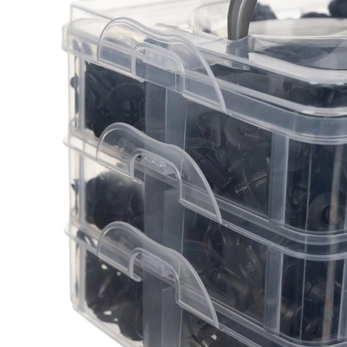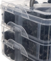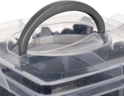 Caja práctica con niveles transparentes y hebillas de seguridad que mantiene los clips ordenados y seguros. Fácil de transportar gracias al asa robusta.
