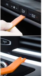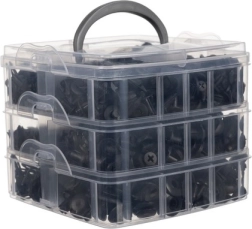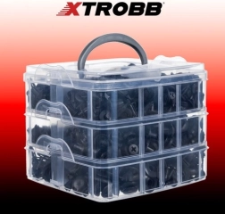 Todo queda ordenado en una caja compacta de tres niveles con hebillas firmes y asa de transporte. Los compartimentos separados ahorran tiempo al buscar el tipo adecuado. Para un desmontaje cuidadoso de los guarnecidos, dispone de 4 palancas de plástico y un extractor metálico con agarre ergonómico, que minimizan el riesgo de dañar las piezas.
