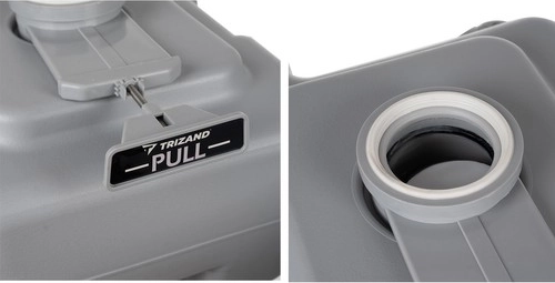 El depósito superior de 12 l para agua con bomba manual permite descargas repetidas; el depósito inferior de 20 l almacena los residuos de forma segura y sin olores.