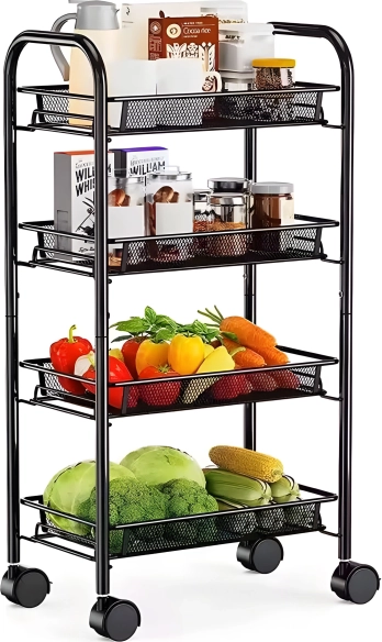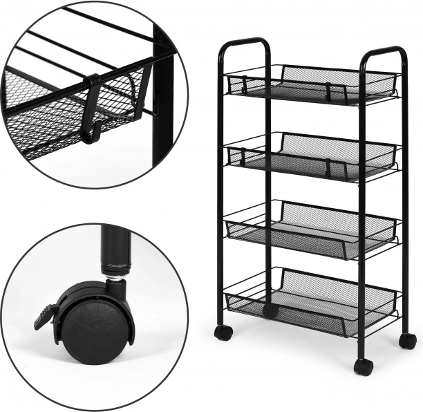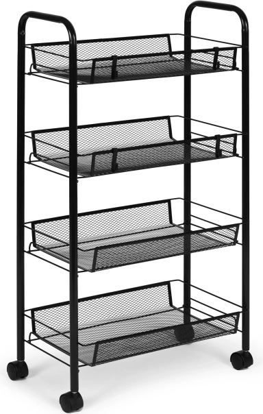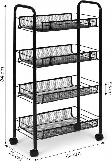 La estantería universal con ruedas ofrece un lugar organizado para especias, alimentos, toallas, cosméticos, libros y juguetes. La estructura de cestas de malla abierta garantiza una gran visibilidad y ventilación, mientras que el marco metálico asegura durabilidad y larga vida útil. Gracias a sus dimensiones compactas de 84 × 44 × 25 cm, aprovecha fácilmente huecos estrechos junto a la encimera o el armario.