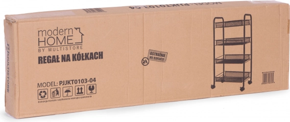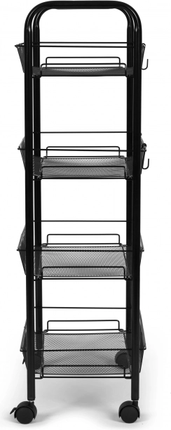 Las cuatro ruedas de deslizamiento suave permiten moverla de una habitación a otra, y dos frenos mantienen la estantería firme en su sitio. Cuatro prácticos ganchos se ocupan de paños, utensilios de cocina o pequeños accesorios. El montaje es sencillo: el producto se suministra para autoensamblaje.