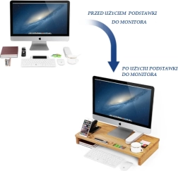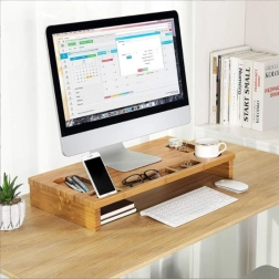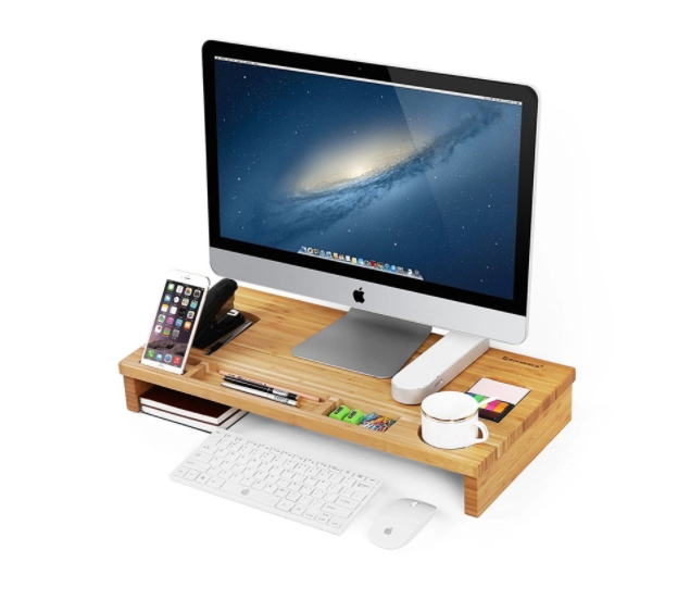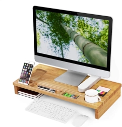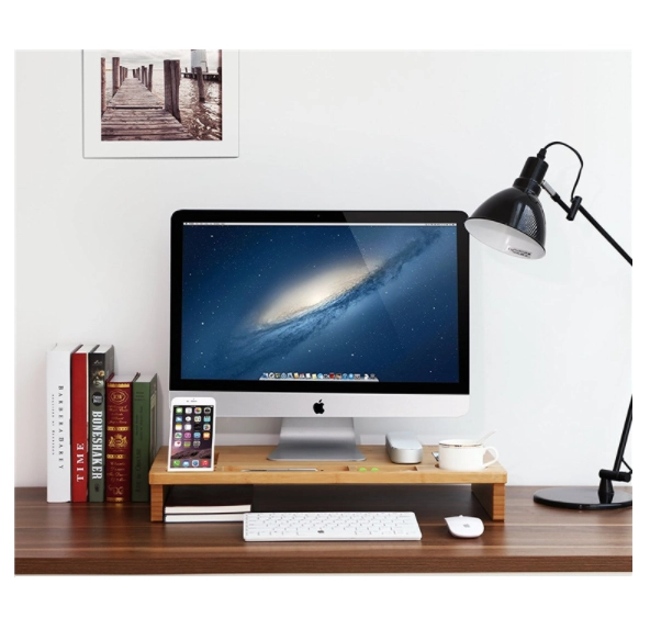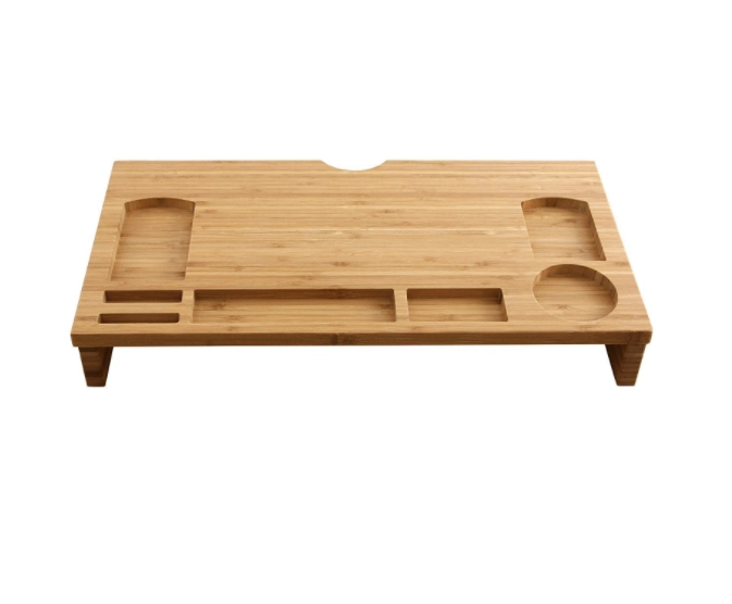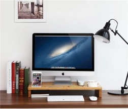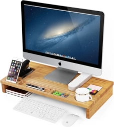 Mejora tu espacio de trabajo con un elegante soporte de bambú que combina ergonomía y organización. Al elevar el monitor a la altura de los ojos, reduce la carga en el cuello y la espalda, mientras que los compartimentos bien pensados mantienen a mano todo lo esencial: desde el teléfono y el material de escritura hasta la taza.