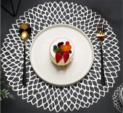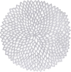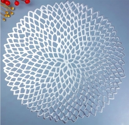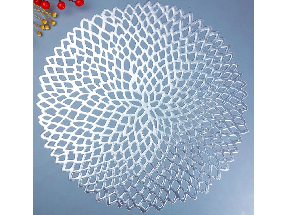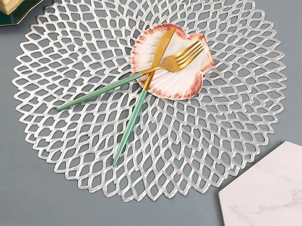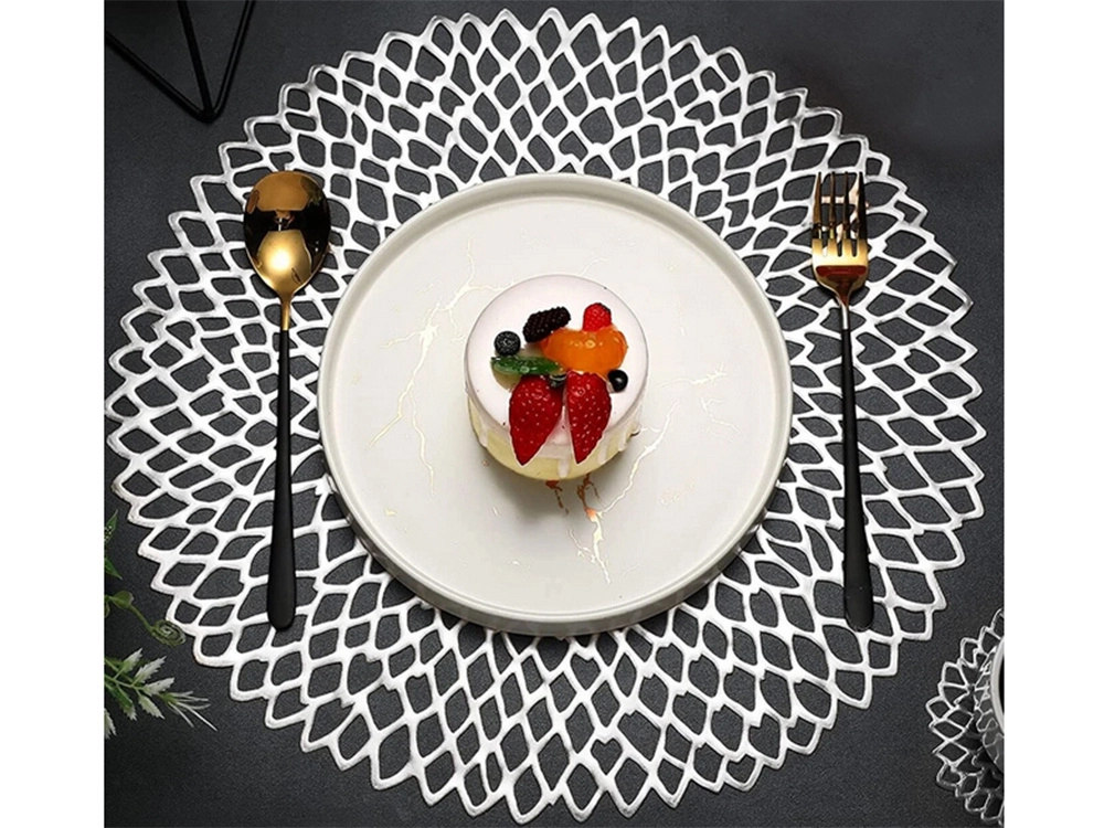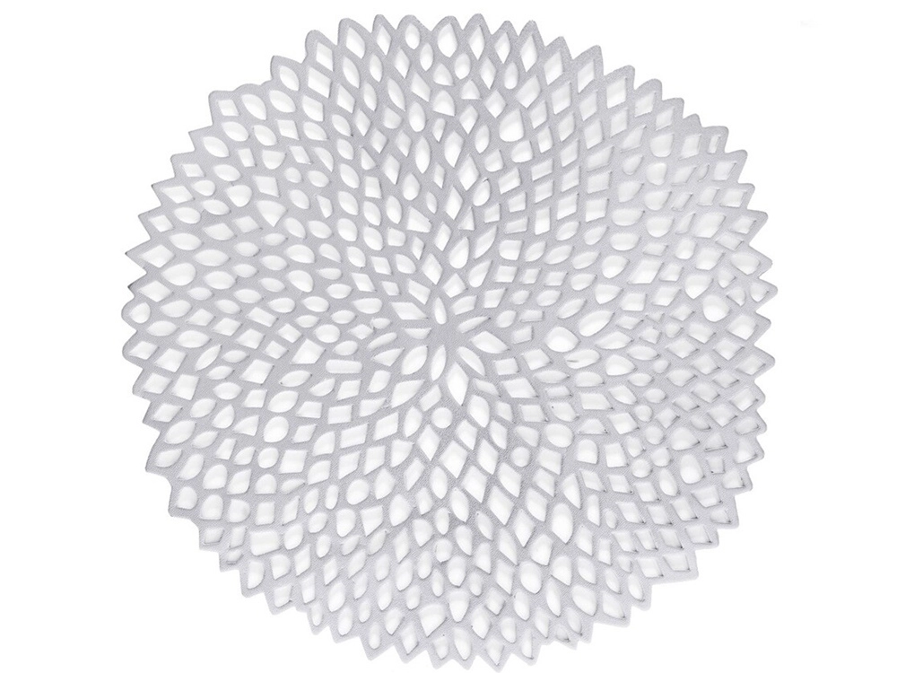 Elegante individual redondo de plástico resistente con diseño calado en color plateado que aporta estilo a tu mesa y a la vez la protege. Diámetro 41 cm, acabado antideslizante, impermeable y fácil de limpiar: ideal para el día a día y ocasiones especiales.