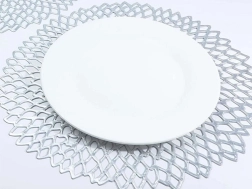 Este individual calado en elegante color plateado protege la superficie de la mesa de arañazos y manchas y a la vez actúa como un destacado elemento decorativo. Gracias al plástico resistente es ligero, práctico e impermeable, perfecto tanto para el uso diario como para ocasiones festivas.