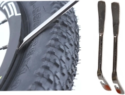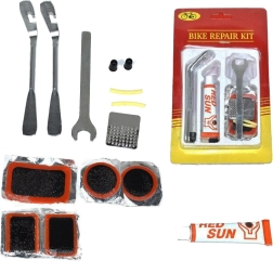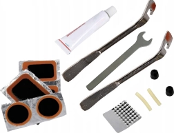Incluye palancas para desmontar neumáticos, llave para ruedas y otras herramientas esenciales que facilitan las reparaciones en ruta.