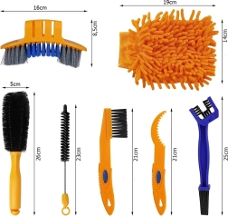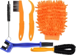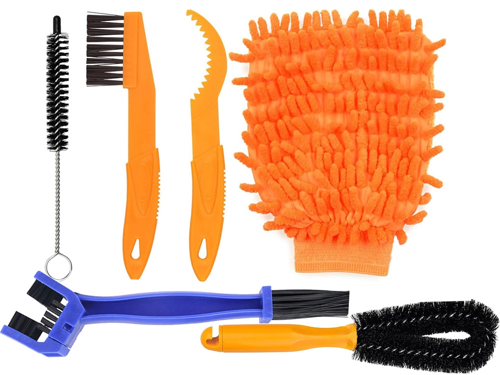 - cepillo para neumáticos, guante de microfibra, cepillo estrecho para ranuras, gancho/rascador para cassette, cepillo para cadena, cepillo universal, cepillo para cassette