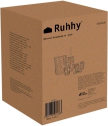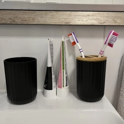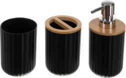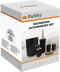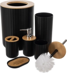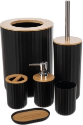 Este set de 6 piezas combina superficies acanaladas en negro mate con acentos de bambú natural. Gracias al plástico resistente PP/ABS y a los elementos de acero inoxidable, es ideal para ambientes húmedos, se limpia fácilmente y mantiene su apariencia elegante durante mucho tiempo.