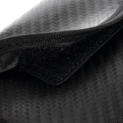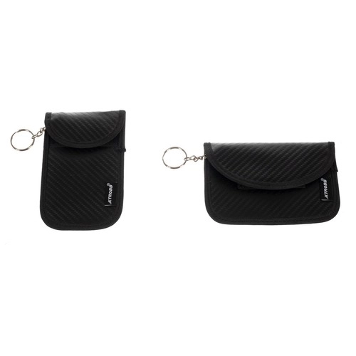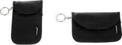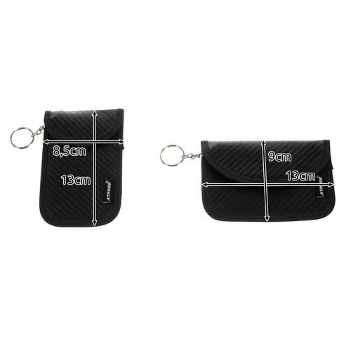 Cada funda dispone de dos bolsillos independientes: el más profundo con anillo para la llave del coche (apantallado) y el más pequeño para tarjetas de pago y de acceso. La superficie resistente de PU con aspecto carbono, el suave acolchado de poliéster y el velcro robusto protegen el contenido frente a daños y caídas accidentales. El juego incluye la variante vertical y la horizontal; la versión horizontal además incorpora un soporte trasero para sujetar en un bolso o mochila.