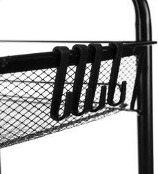 Cuatro ruedas para un traslado sencillo, dos de ellas con freno para un bloqueo firme. Los ganchos laterales ofrecen espacio extra para paños, utensilios o pequeños objetos.