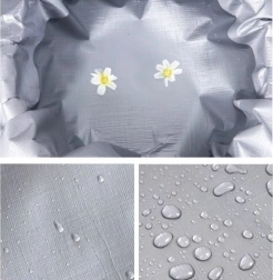 La resistente lona de 3 × 4 m está fabricada en HDPE y cuenta con recubrimiento de LDPE para una impermeabilidad máxima y larga vida útil. El diseño por ambas caras en color plata‑gris refleja la radiación solar y mejora la protección de los objetos cubiertos.