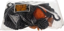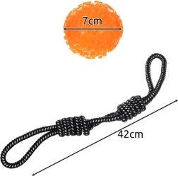 La cuerda en blanco y negro y la goma texturizada en color naranja soportan un uso intensivo y ayudan a limpiar los dientes y masajear las encías durante el juego.