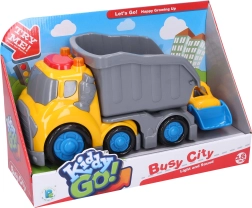 Con este set de vehículos de construcción Kiddy, los niños disfrutarán de horas de diversión creativa. El camión volquete con remolque tiene puertas móviles y efectos activados por un botón en el techo de la cabina, mientras que el bulldozer está equipado con una cuchara móvil para cargar y descargar. Gracias a las ruedas libres, los vehículos se manejan fácilmente incluso por los conductores más pequeños.