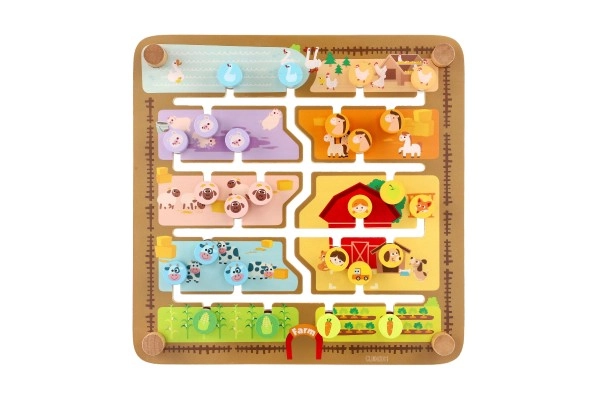 Una ayuda inteligente y divertida para preescolares: el tablero de doble cara esconde dos mundos. En la granja, los niños deslizan fichas con animales, caras y frutas por ranuras fresadas hasta su lugar. Al girar el tablero, se convierte en un laberinto del abecedario: la tarea es llevar la ficha con la letra inicial hasta el animal correcto (los nombres están en inglés), por lo que se practican letras y vocabulario de forma lúdica.