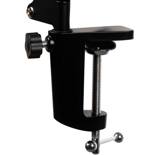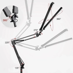 El brazo regulable permite la rotación en varios planos (360 / 225 / 270 / 135 grados), lo que aumenta la flexibilidad de uso. La instalación es posible tanto con abrazadera como con base, lo que garantiza un uso universal en diferentes entornos, ya sea en casa o en la oficina.