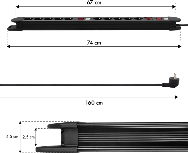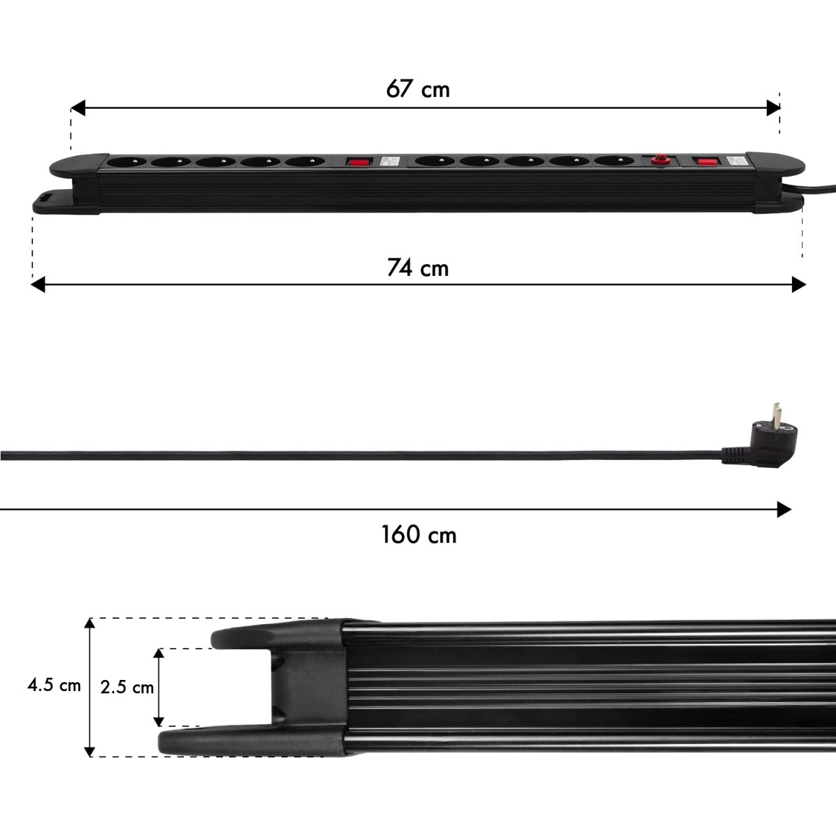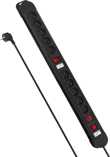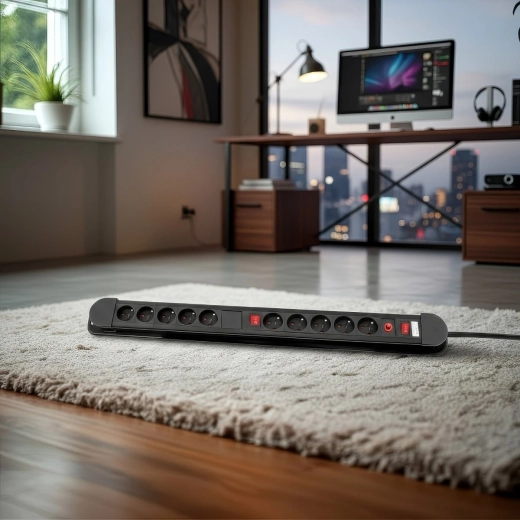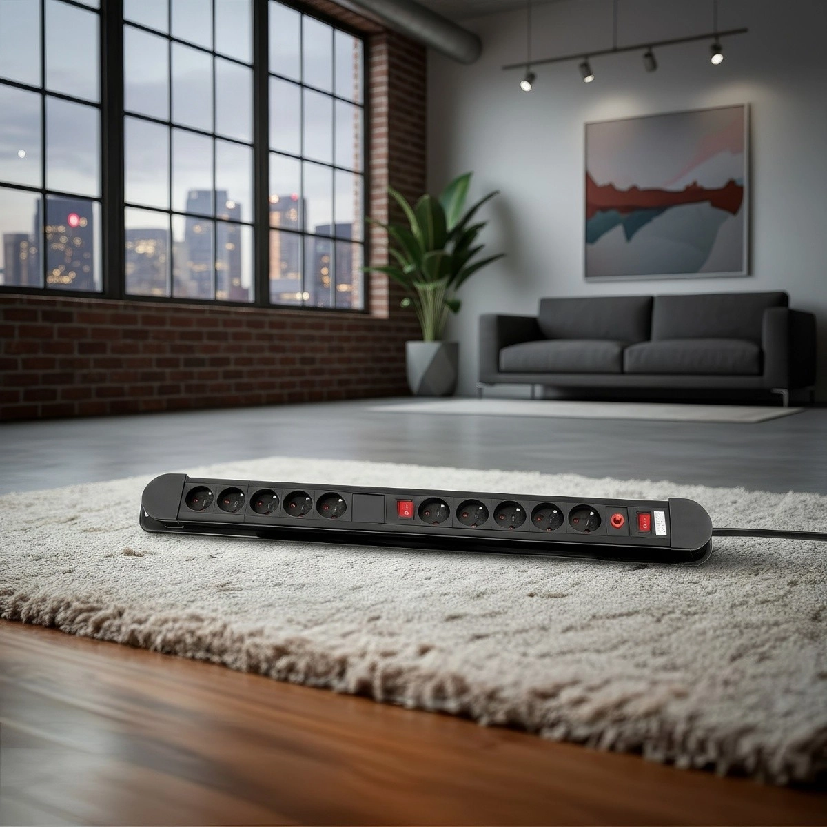 Amplíe la alimentación de sus dispositivos de forma inteligente y segura. Esta robusta regleta con 10 tomas con puesta a tierra ofrece un control flexible del consumo gracias a dos interruptores independientes: cada mitad de la regleta funciona por separado. La protección la garantiza un interruptor automático integrado que actúa de inmediato en caso de sobrecarga o cortocircuito.
