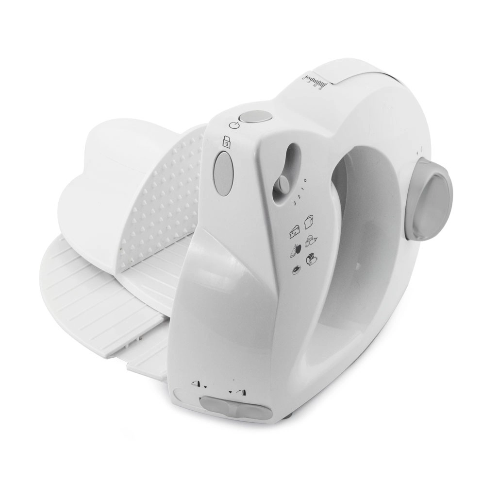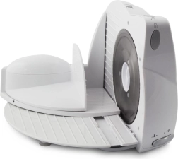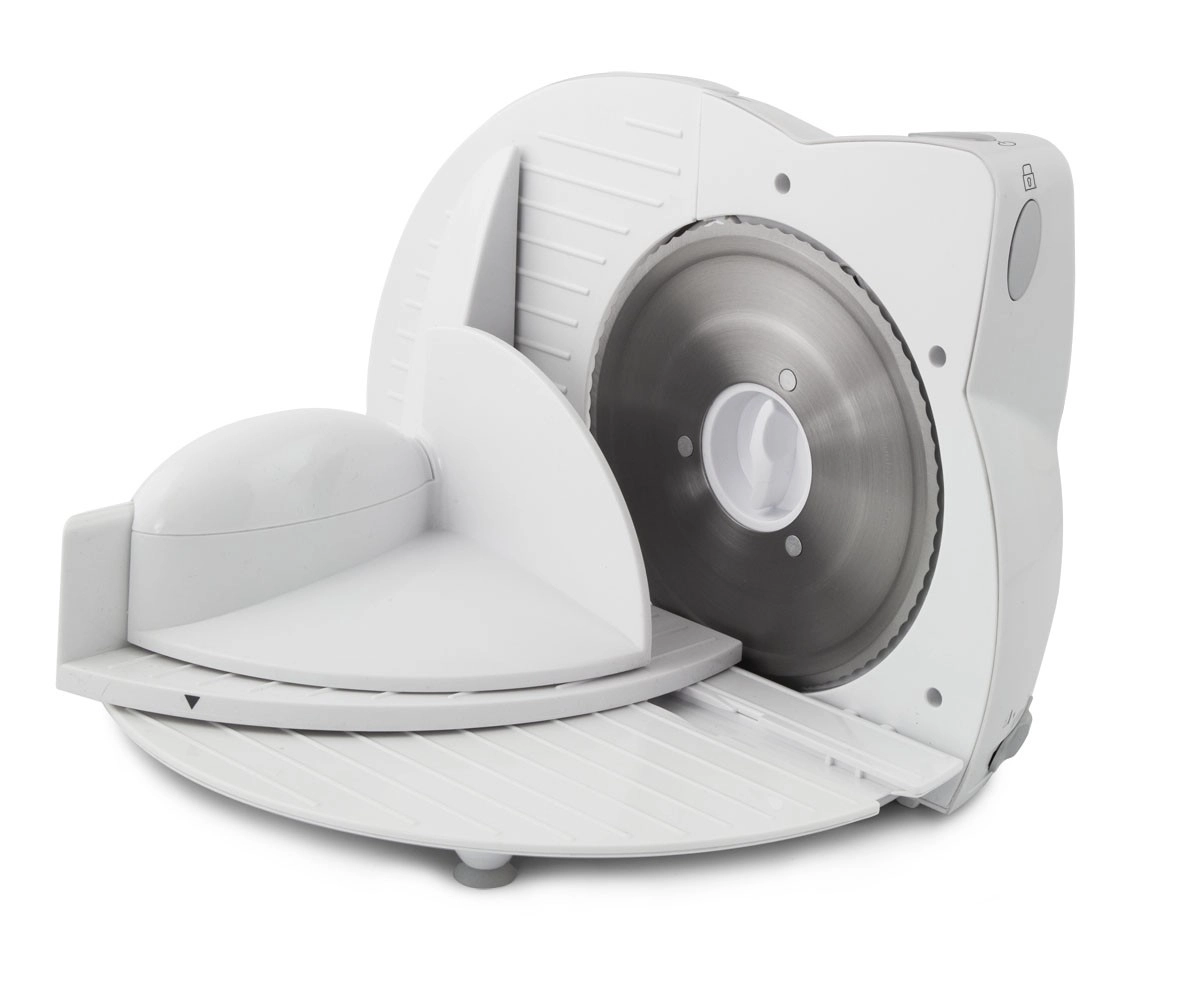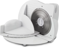 Cortafiambres eléctrico compacto de 150 W que permite cortar pan, embutidos, quesos, frutas y verduras en lonchas uniformes. Gracias a la amplia regulación del grosor podrás ajustar fácilmente el corte ideal para cada tipo de alimento. Tu seguridad está garantizada por el bloqueo de seguridad y la estabilidad por las ventosas antideslizantes.