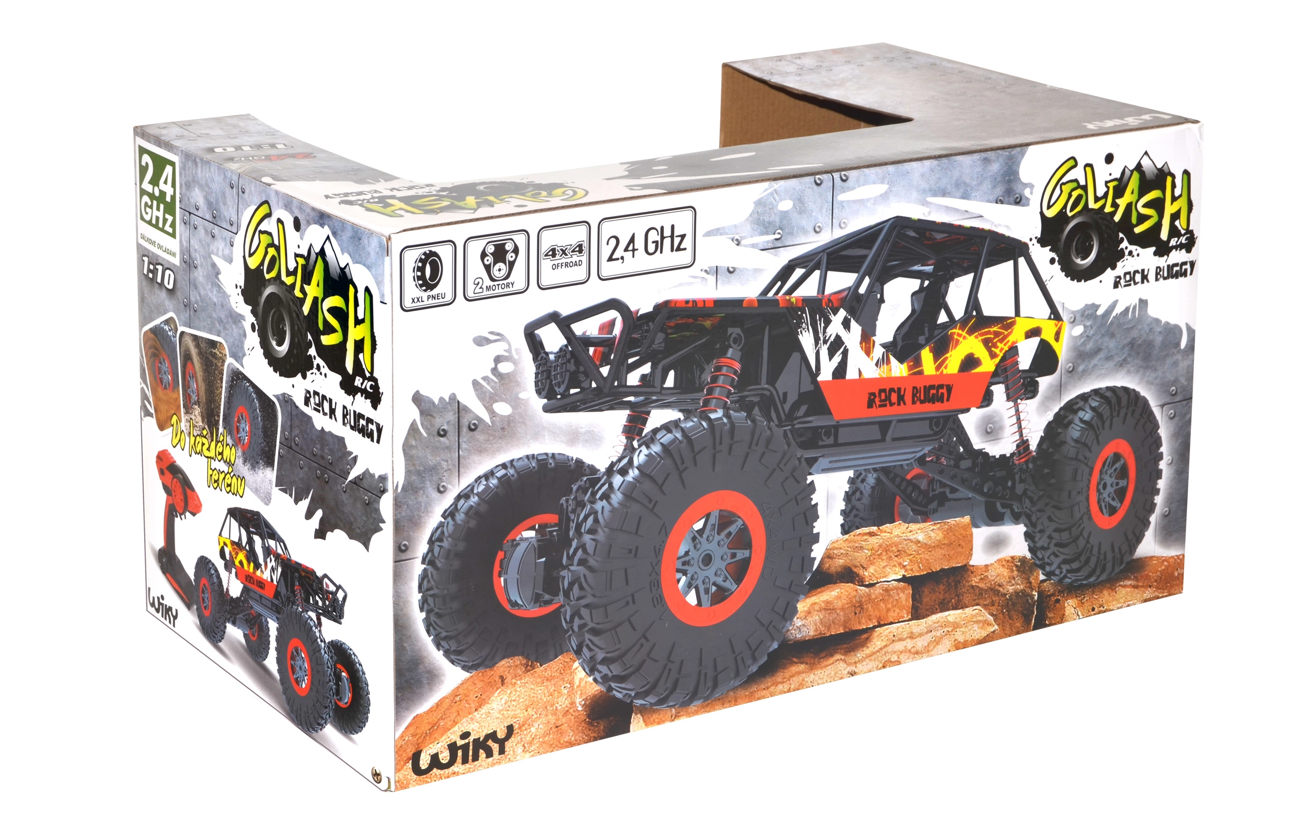 El legendario todoterreno Rock Buggy Goliash está creado para superar obstáculos exigentes. Sus grandes ruedas con super dibujo y ranurado, dos motores y tracción a las cuatro ruedas garantizan una capacidad todoterreno insuperable. Con su robusta suspensión no teme a la hierba, las piedras ni las irregularidades.