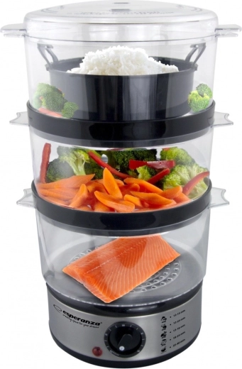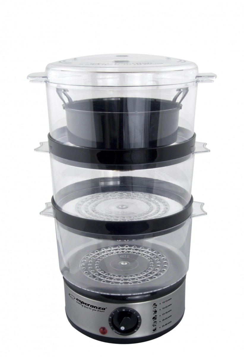 La olla de vapor eléctrica Esperanza Steam Volcano permite cocinar de forma saludable sin grasa, conservando el sabor y los nutrientes. Gracias a sus tres recipientes espaciosos podrás preparar varios platos a la vez, mientras que el temporizador integrado facilita una sincronización perfecta. Su diseño sencillo garantiza un manejo y limpieza fáciles, ideal para la cocina diaria.