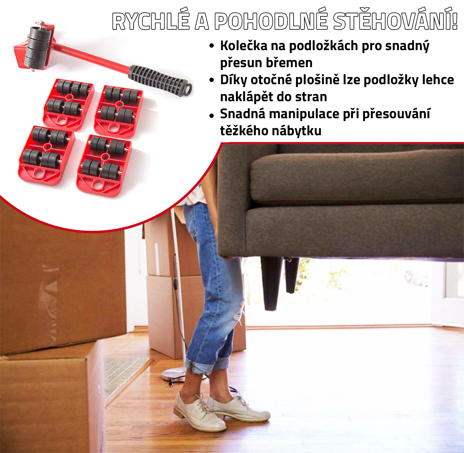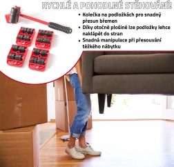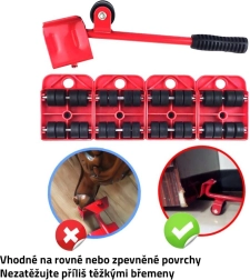 Práctico juego para mover fácilmente piezas pesadas de muebles y electrodomésticos de hasta 150 kg. Incluye un palanca elevadora para levantar el mueble y cuatro rodillos de transporte con base antideslizante y giro de 360°, gracias a los cuales podrás desplazar la lavadora, el frigorífico o la cómoda rápida, segura y sin esfuerzo.