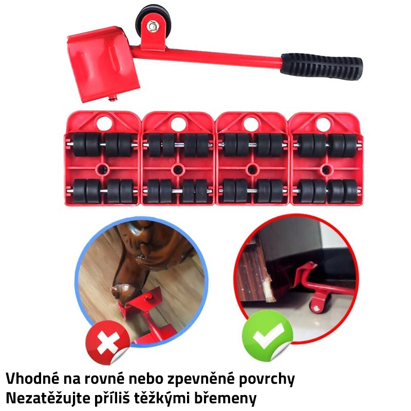 Este juego compacto y funcional es ideal para el hogar, la oficina y el taller. Con la palanca elevadora levantarás el mueble fácilmente y colocarás un rodillo de transporte bajo cada esquina. La superficie antideslizante mantiene el objeto estable y la plataforma giratoria de 360° permite una dirección precisa sin forzar la espalda.