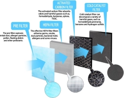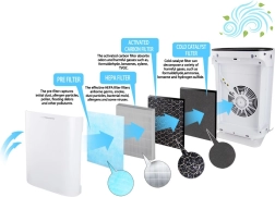 Captura hasta el 99,97 % de alérgenos, polen y polvo gracias a su filtro de 4 etapas: prefiltro, filtro de carbón activado, filtro HEPA H11 y filtro catalítico en frío.