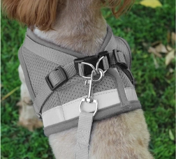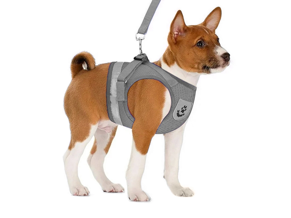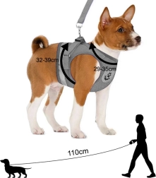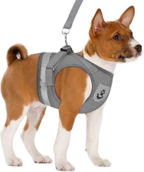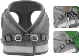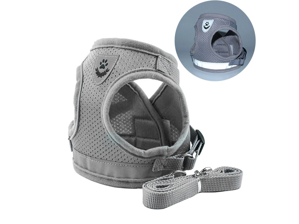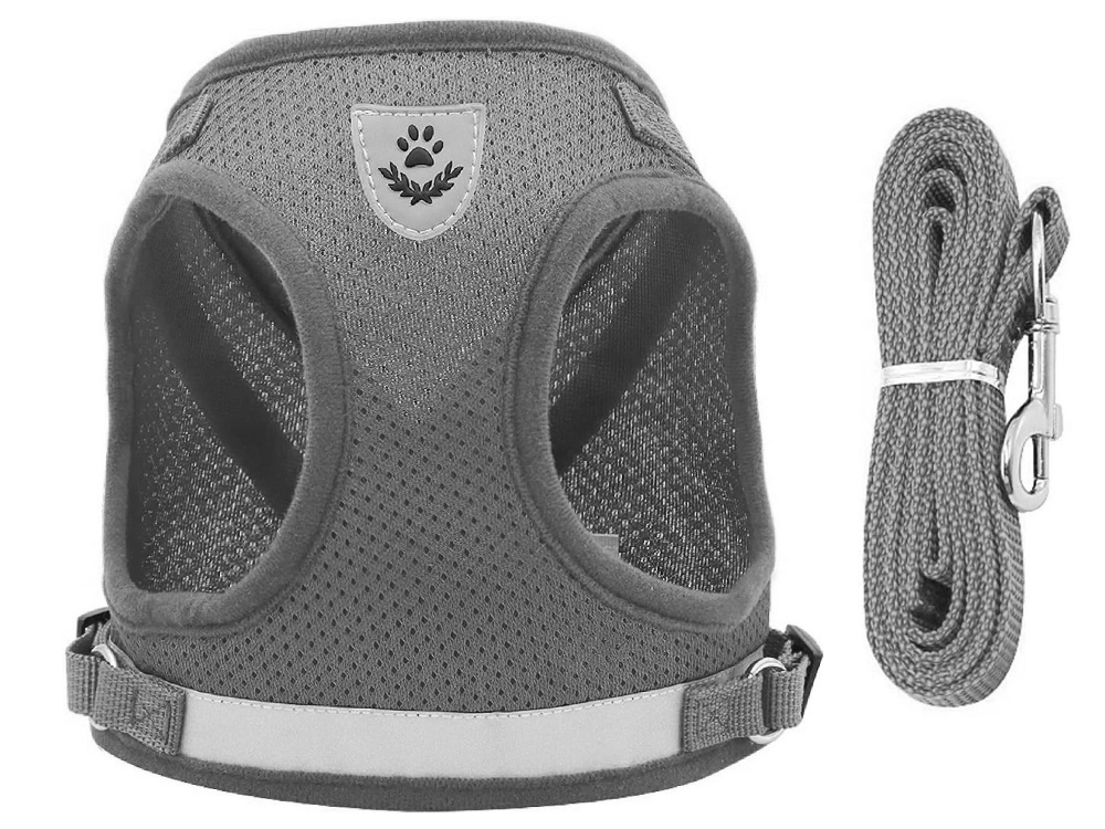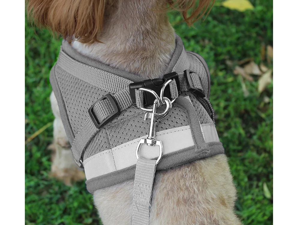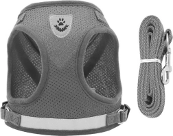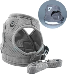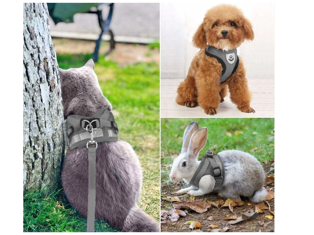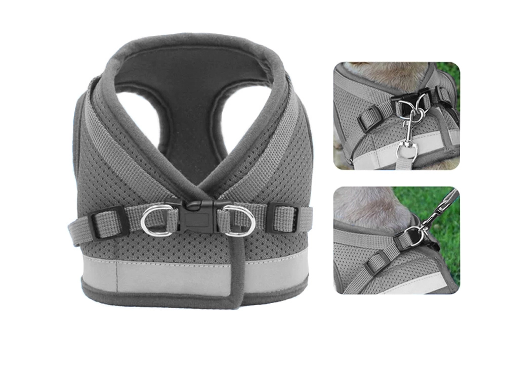 El arnés sin presión en color gris está diseñado para perros, gatos y conejos. El tejido transpirable con acolchado suave ofrece comodidad sin rozaduras y permite que la piel respire. Las correas ajustables se adaptan fácilmente al cuerpo del animal para que el arnés quede firme y no limite el movimiento.
