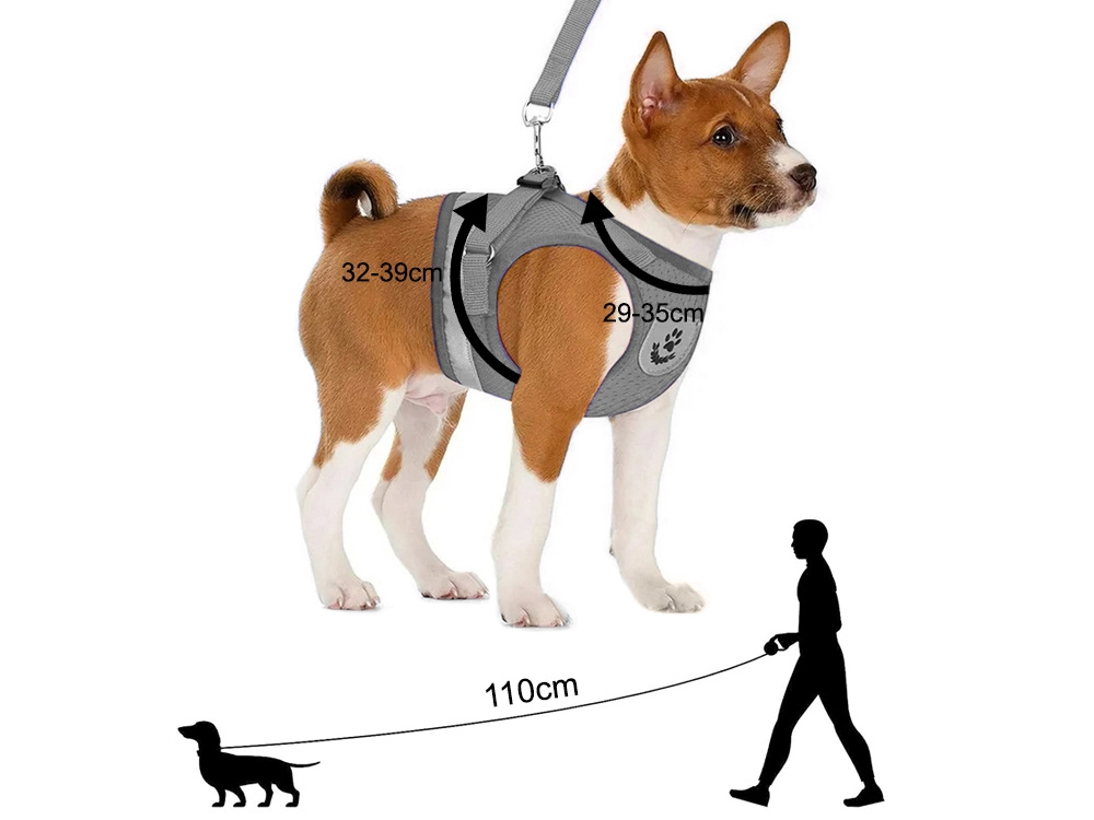 El arnés con forma anatómica distribuye uniformemente la tracción sobre el pecho, no roza ni limita. La malla transpirable y el acolchado suave aumentan la comodidad incluso en paseos largos.