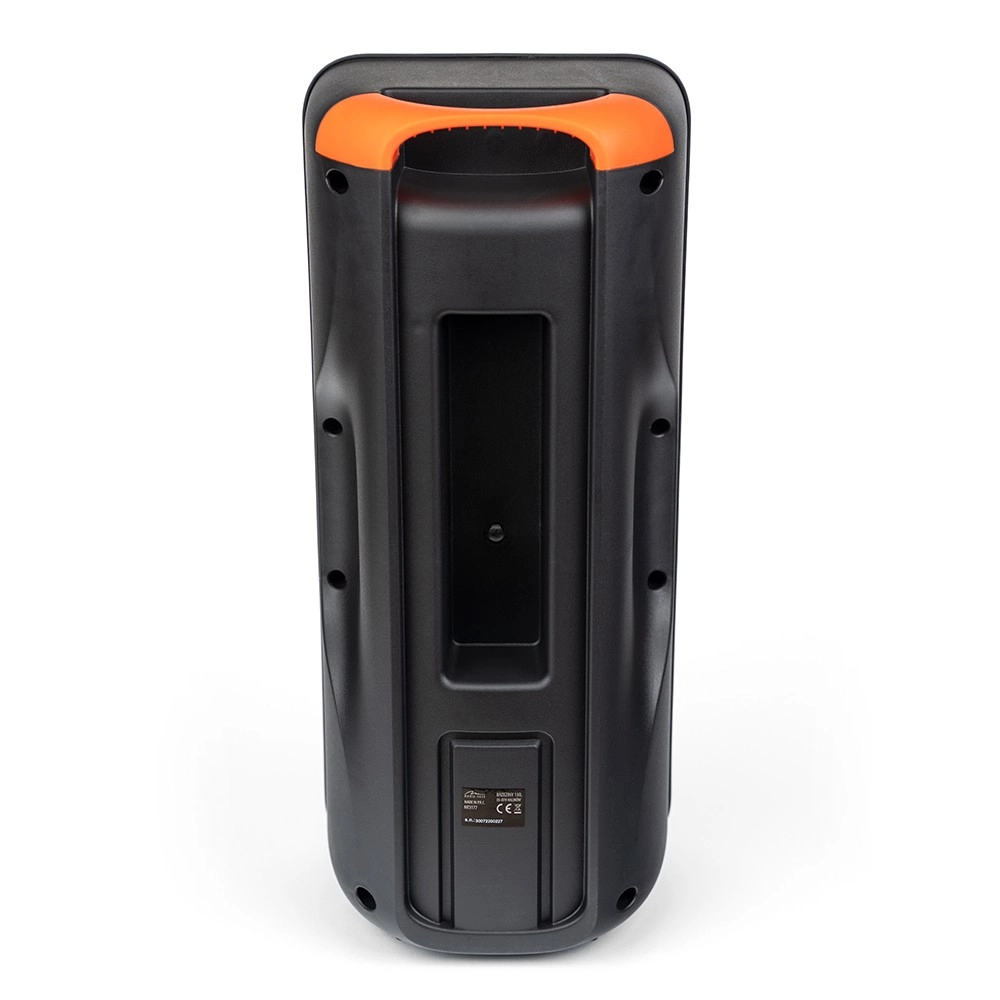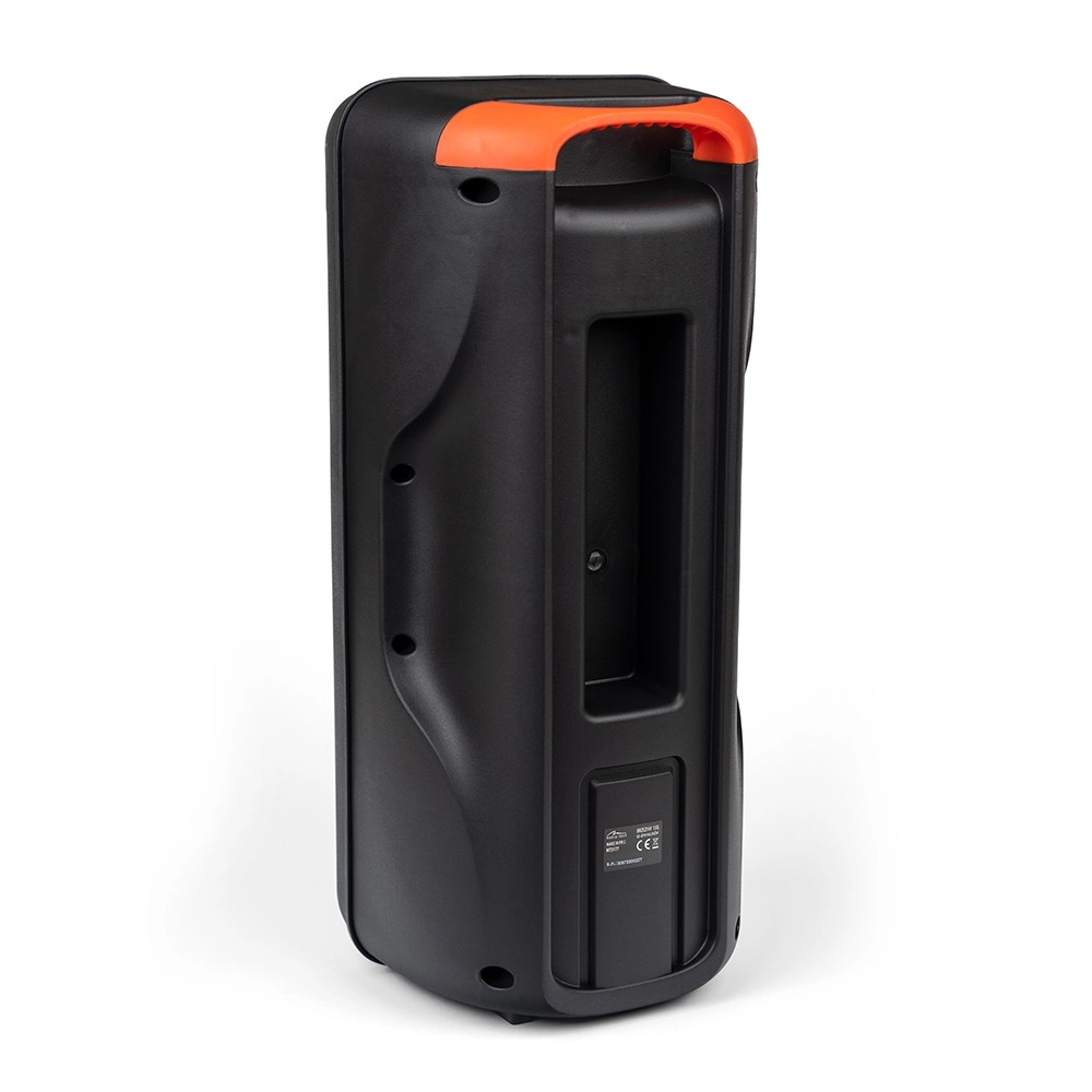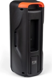 El diseño bien pensado incluye un panel frontal con botones de control, puertos para diversas conexiones y un asa práctica para transportarlo con facilidad. El paquete incluye también un cable de carga y un cable AUX.